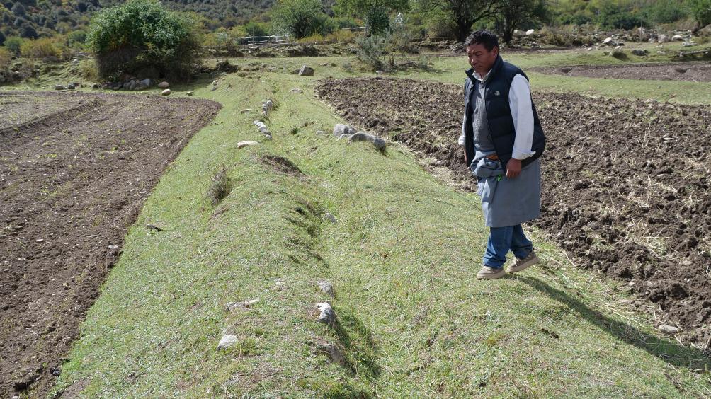 10月21日,忠玉村黨支部書記才旺多吉查看土石夯成的老水渠。新華社記者魏冠宇 攝