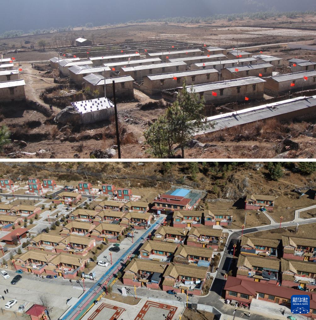 拼版照片,上圖為:2005年拍攝的達(dá)曼新村(新華社發(fā));下圖為:2024年12月15日拍攝的達(dá)曼新村(無人機(jī)照片,新華社記者丁增尼達(dá)攝)。新華社發(fā)