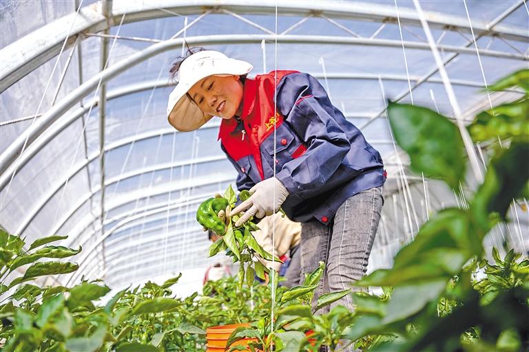 拉薩冬意漸濃,園區(qū)連片的溫室大棚,在冬日暖陽下熠熠生輝,宛如一個個孕育希望的“菜籃子”,豐富冬日市場供應。走進蔬菜大棚,棚內(nèi)暖意融融、綠意盎然,黃瓜、西紅柿、青椒等各類蔬菜均已進入成熟期,長勢十分喜人。眼下,正是大棚青椒采摘期,一壟壟、一株株青椒掛滿枝頭,工作人員三五成群忙著采摘,現(xiàn)場一派繁忙景象?!安烧嘟芬蛏险?,這樣才不會損傷植株?!痹诘┰銮闹笇?,工作人員很快完成了采摘工作,打包、稱重后,37袋青椒被整齊地擺放在一起,等待著裝車發(fā)貨。