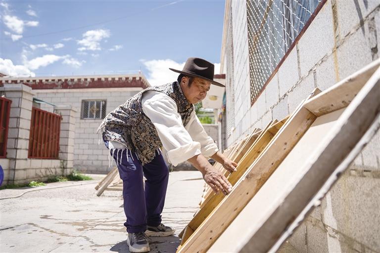 格桑旦增正在制作雪拉藏紙。