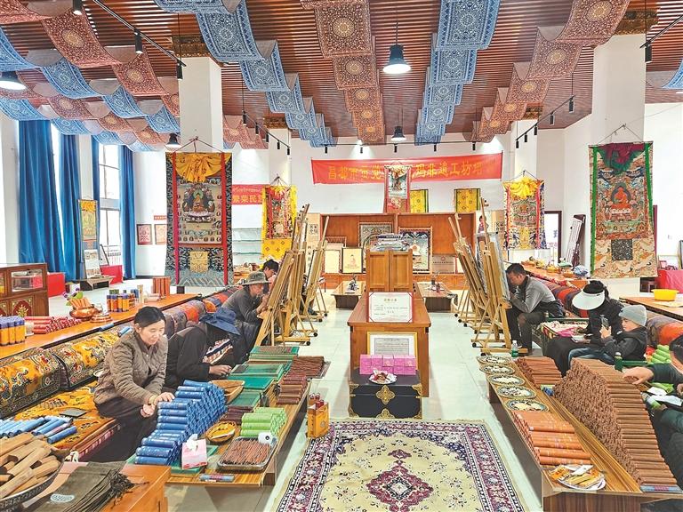 黨建引領,產(chǎn)業(yè)提質。在當?shù)攸h委、政府的大力扶持下,政策引導、資金注入、平臺搭建等利好舉措相繼落地。短短4年間,貢覺縣桑珠榮村一處不起眼的廠房華麗轉身,變?yōu)樯V闃s村民族手工業(yè)孵化基地,堤無瑪藝術傳承合作社也應運而生,成為該村的集體經(jīng)濟組織。