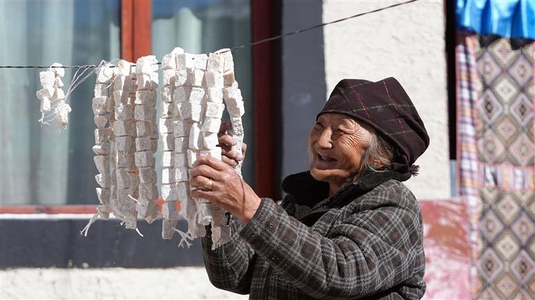 洛桑塔杰的老伴在晾曬奶渣。文/圖 通訊員 次昂 記者 張雪芳