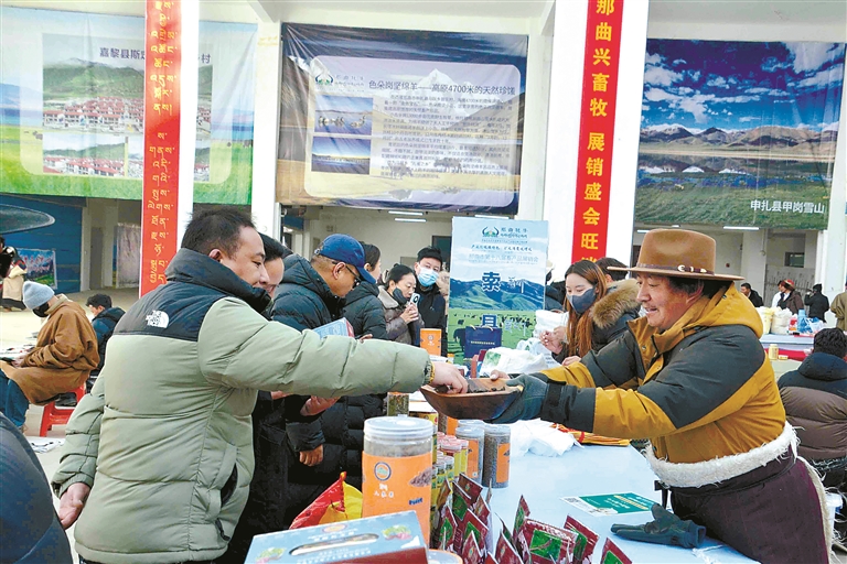 這次展銷會不僅線下熱鬧,線上也同樣火爆。為了讓各類產(chǎn)品走得更遠,展銷會特意搭建起“線上直播帶貨+線下現(xiàn)場選購”的雙線銷售通道,一邊是線下市民現(xiàn)場挑、現(xiàn)場買,新鮮看得見、品質(zhì)摸得著;一邊是主播對著鏡頭,向全國網(wǎng)友推介那曲好物,讓遠在千里之外的消費者也能品嘗到那曲味道。同時,展銷會還邀請電商平臺、采購商代表和參展商精準對接,幫本土農(nóng)畜產(chǎn)品打通銷路,再也不愁“酒香巷子深”;積極引導(dǎo)機關(guān)、企事業(yè)單位及社會各界參與消費幫扶,以“以購代扶”“以買促銷”的方式助力本土產(chǎn)業(yè)發(fā)展,在全市形成“人人支持本土產(chǎn)業(yè)、人人參與鄉(xiāng)村振興”的濃厚氛圍。