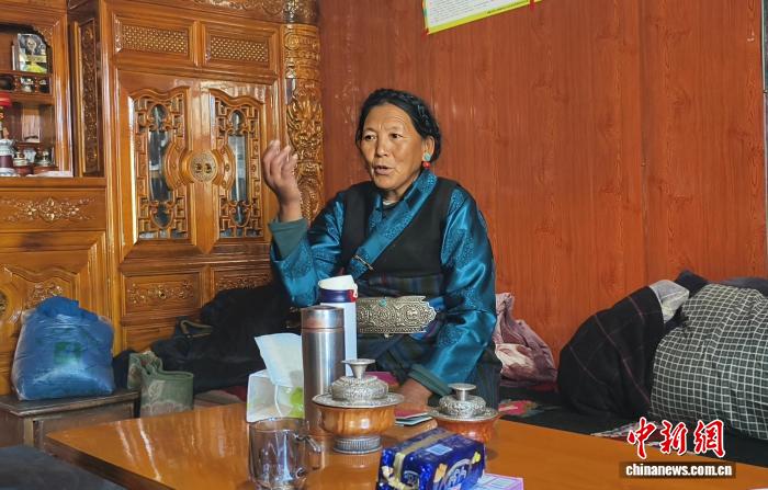 圖為定日縣長所鄉(xiāng)森嘎村村民講述搬進(jìn)新家后的美好生活。貢桑拉姆 攝