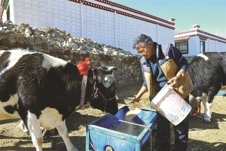 近日,記者走進(jìn)拉薩市墨竹工卡縣工卡鎮(zhèn)格桑村村民擋桑家中,一家人正忙著裝修新房,后院牛舍整齊干凈,一頭頭黑白花良種奶牛膘肥體壯、毛色光亮,正悠閑啃食飼草??粗约业摹皩氊悺?,擋桑滿(mǎn)臉自豪:“現(xiàn)在養(yǎng)牛越來(lái)越順手,每年收入都很可觀?!?/p>