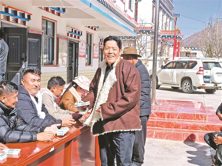 圖為芒康縣朱巴龍村村民喜領(lǐng)分紅。記者 黃澤陽(yáng) 攝