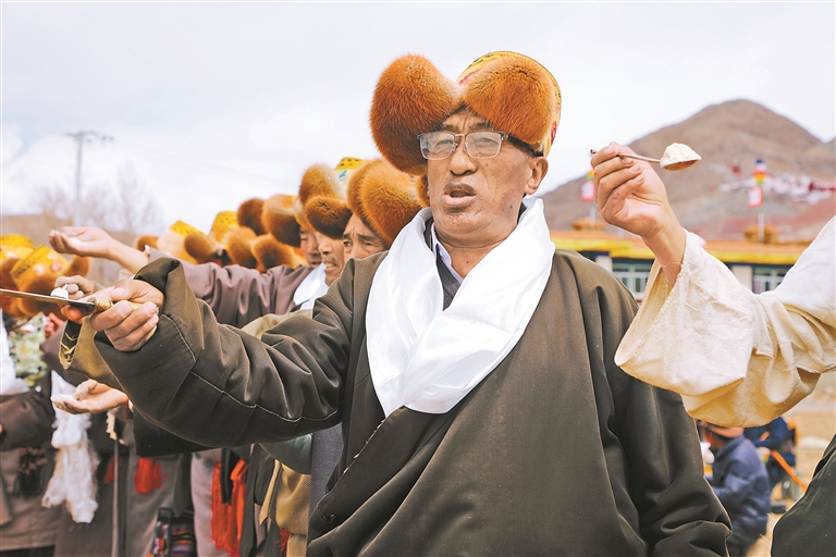 春耕春播儀式上,村民手持糌粑,祈愿五谷豐登、青稞豐收。(圖片由林周融媒提供)