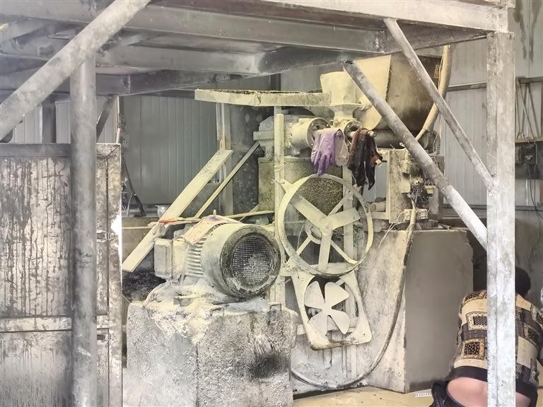 4月10日11時(shí)許,記者跟隨城關(guān)區(qū)市場(chǎng)監(jiān)管局執(zhí)法人員穿過(guò)米瓊?cè)账淼?,?lái)到一處由幾間簡(jiǎn)易鐵皮房圍建而成的院落。該院落臨近米瓊?cè)丈铰?,從外面看,任誰(shuí)也想不到這里是一家制粉廠。院落左側(cè)有一間不足60平方米的加工室,室內(nèi)一個(gè)寫有“粉料攪拌機(jī)”字樣的儀器上,布滿了白色污垢。