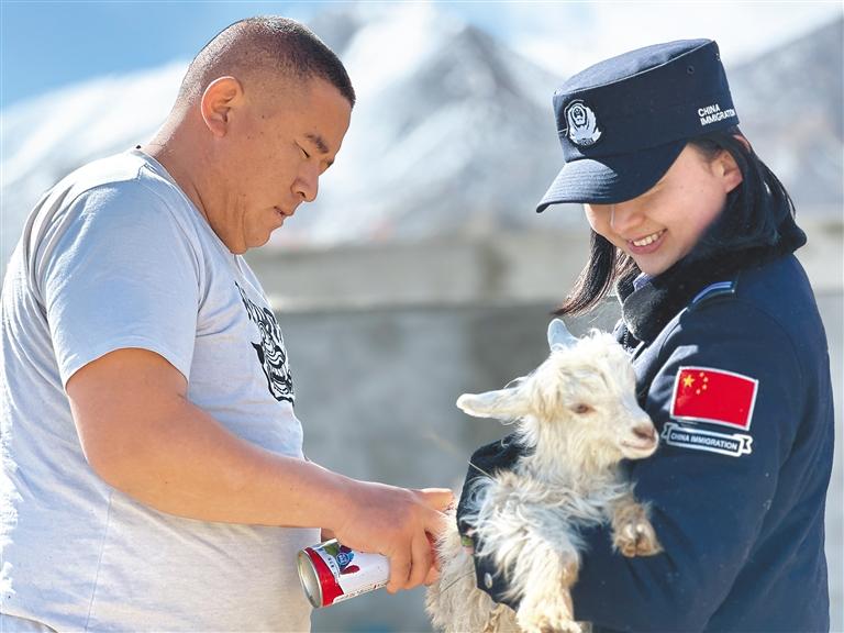 圖為日土邊境派出所民警李泉嫻(右)幫助村民給小羊羔噴標(biāo)記。 本報記者 張宇 本報通訊員 任博 攝