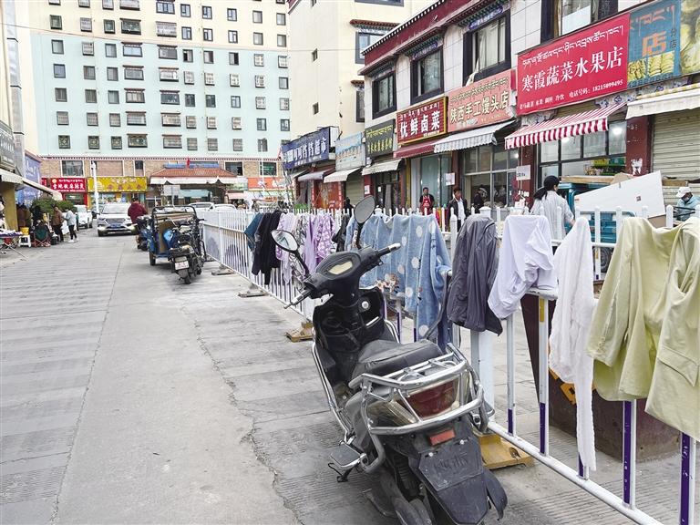 商家在護(hù)欄上晾衣服。