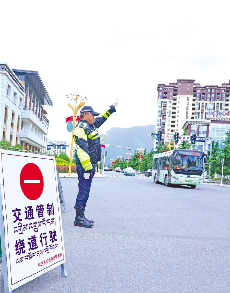 圖為林芝市公安交警在考場周圍指揮交通,維護(hù)安全有序的考場周邊交通環(huán)境。