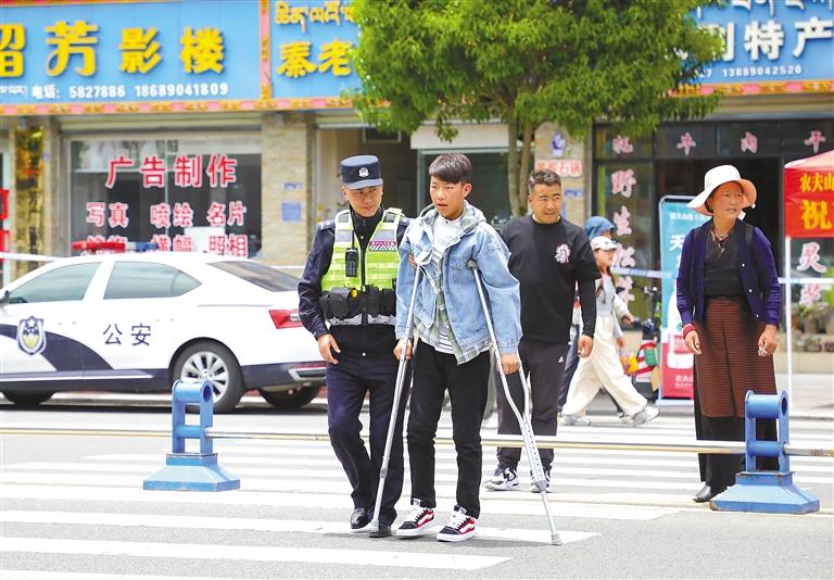 圖為林芝市公安民警幫助行動有困難的考生順利到達(dá)考場。