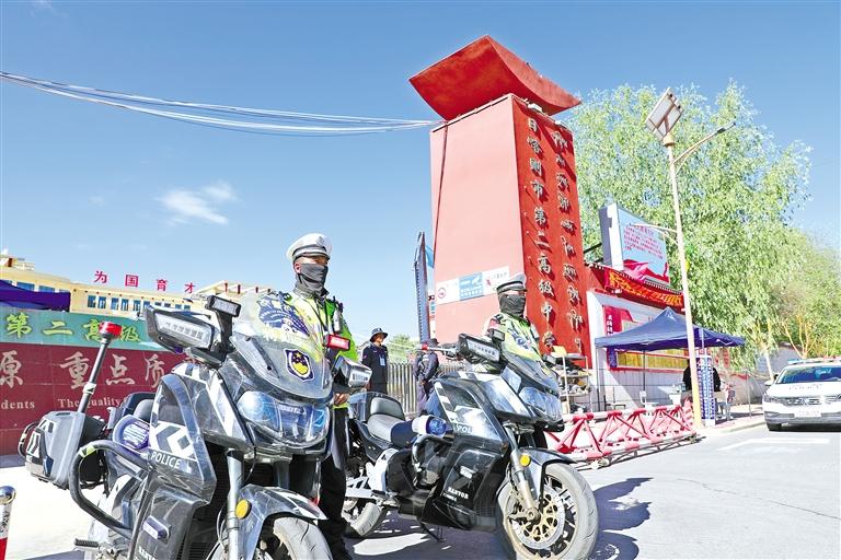 圖為日喀則市公安交警在考場外執(zhí)勤,為考生營造安靜有序的考試環(huán)境。 本報記者 彭琦 攝