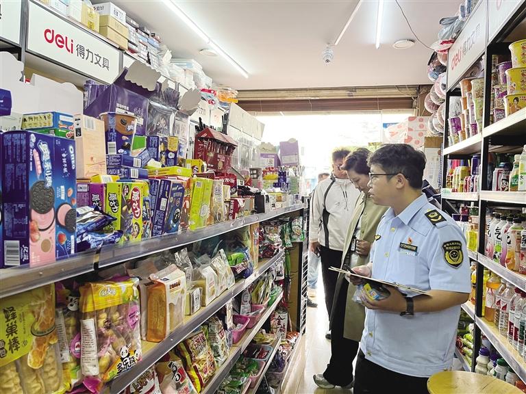 檢查組對(duì)校園周邊小賣(mài)部進(jìn)行檢查。