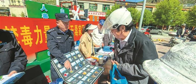 圖為比如縣公安局法制科民警在街頭開展禁毒宣傳。本報(bào)記者 彭琦 攝