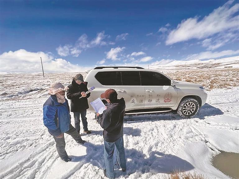 在雙湖縣,人民法院車載科技流動法庭日行千里,加強與生態(tài)管護站、行政村協(xié)作,構建“庭·站聯(lián)合”生態(tài)預警網(wǎng)格,及時發(fā)布司法保護令和環(huán)保倡議書。在安多縣,法院干警翻越唐古拉山,深入森布日生態(tài)搬遷安置點,通過“加強聯(lián)絡暢渠道”工作法,與群眾促膝長談,傾聽民意;雁石坪人民法庭干警還主動加入格拉丹東“長江第一滴水”志愿巡護隊,聘請當?shù)攸h員志愿巡護隊員擔任生態(tài)法治巡護聯(lián)絡員,凝聚保護青藏高原生態(tài)的法治合力。