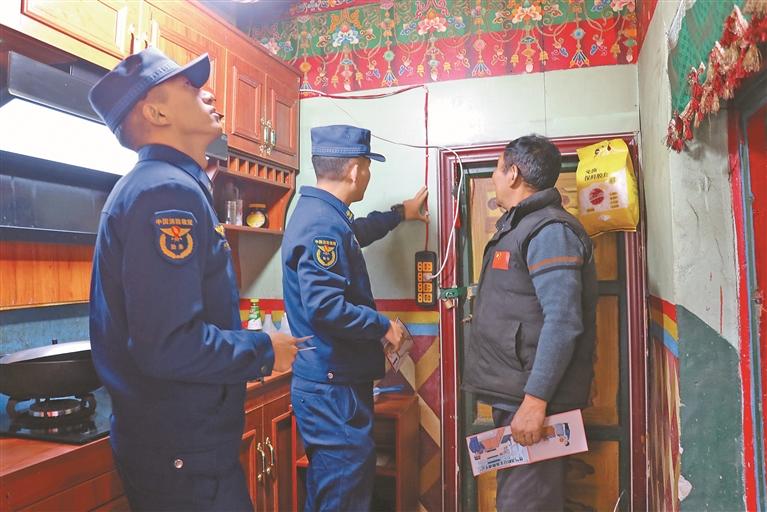 康馬縣消防救援大隊(duì)宣傳員深入農(nóng)牧民家中排查火災(zāi)隱患。次仁普赤 攝