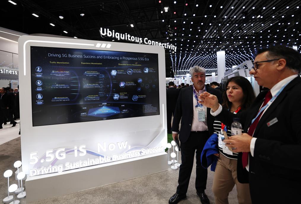 2月28日,在西班牙巴塞羅那舉行的2024年世界移動通信大會上,人們在華為展臺關(guān)注5G-A技術(shù)。新華社記者高靜 攝