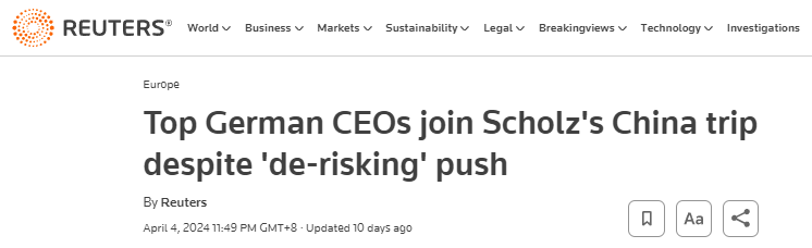 路透社分析稱,這份高管名單,凸顯了中國(guó)作為德國(guó)最大貿(mào)易伙伴的“重要份量”。