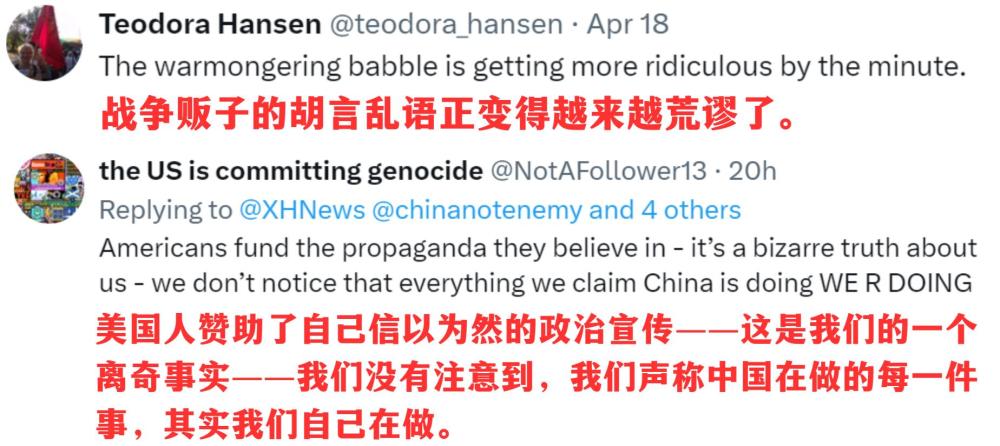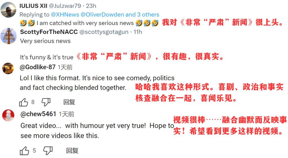 脫口秀播發(fā)后,英國議會議員喬治·加洛韋、倫敦廣播公司主持人丹尼絲·黑德利、倫敦都市大學副教授康斯坦丁諾斯·皮塔基、美國反戰(zhàn)組織“粉色代碼”等機構(gòu)和個人賬號紛紛轉(zhuǎn)贊評。網(wǎng)友們在評論區(qū)呼吁:這樣有趣又有料的節(jié)目,多多益善!