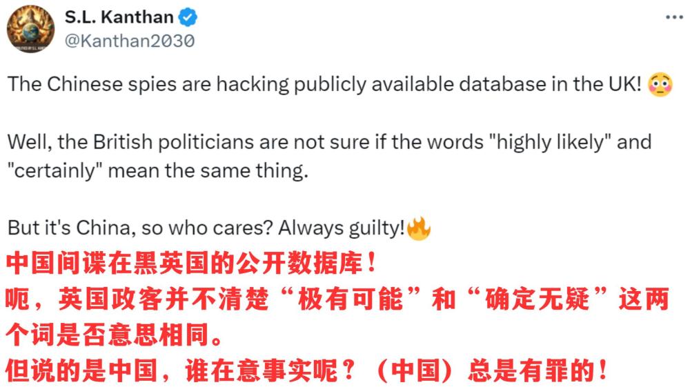 更重要的是,相關(guān)政客言論中的邏輯謬誤也讓人不忍直視。脫口秀特意截取了英國議會議員帕特·麥克法登的提問:“副首相為什么認為中國政府會去黑一個公開數(shù)據(jù)庫?”這也讓美國作家馬意駿忍俊不禁: