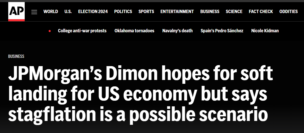 近日,摩根大通公司首席執(zhí)行官杰米·戴蒙在接受美聯(lián)社采訪時稱,他對美國經(jīng)濟仍保持“審慎”,并表示通脹可能會在更長時間內(nèi)變得更棘手,“滯脹也可能是(美國經(jīng)濟面臨的)一種情況”。