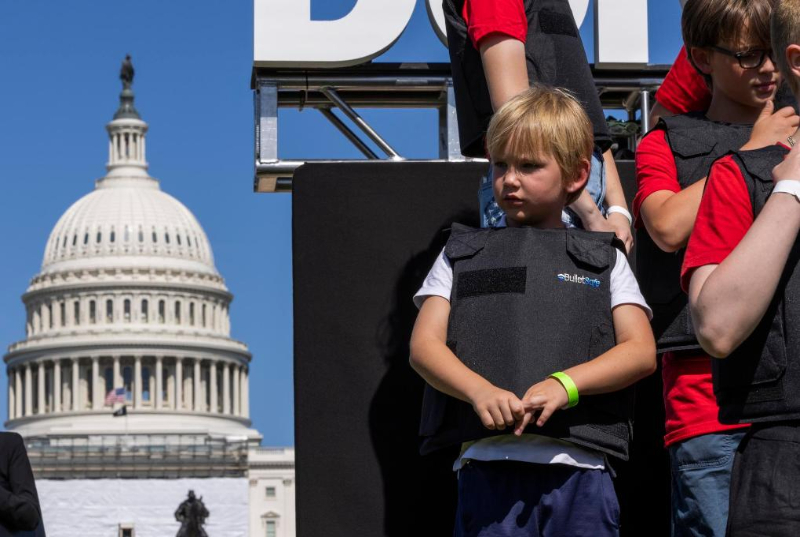 2022年6月6日,學(xué)生們身穿防彈衣在美國華盛頓的國會大廈前參加名為“不要回避”的抗議活動,呼吁立法機構(gòu)正視美國槍擊案頻發(fā)的社會問題,要求加強槍支管控立法。新華社發(fā)(亞倫攝)