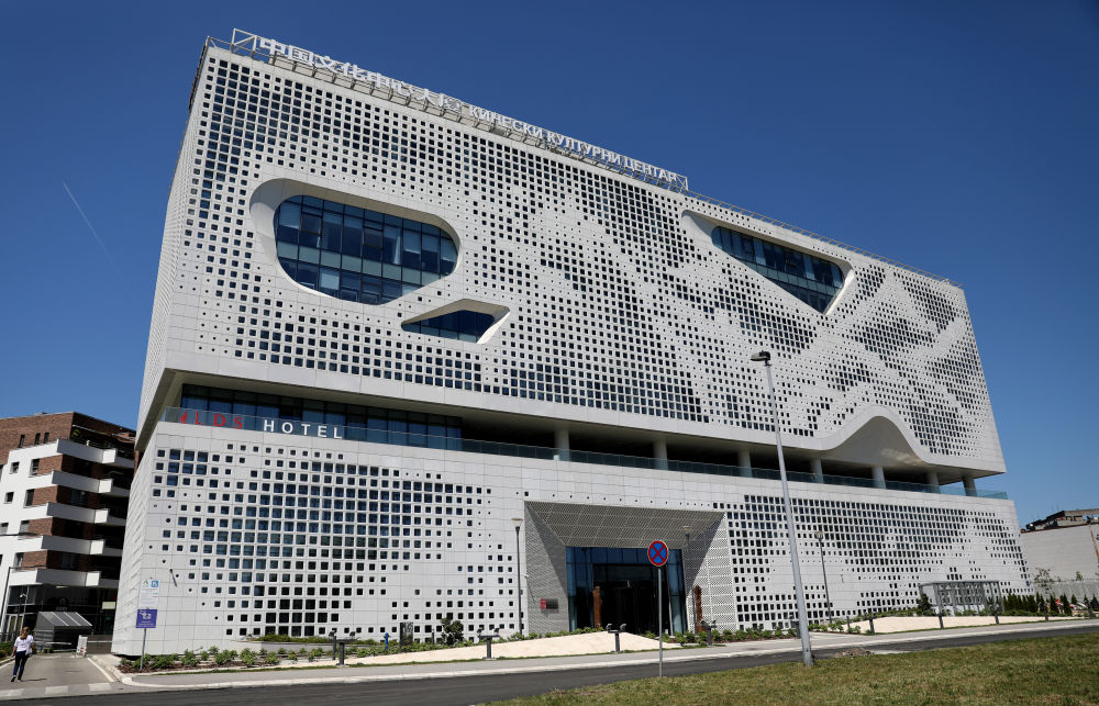 2024年4月28日在塞爾維亞首都貝爾格萊德拍攝的中國(guó)文化中心。建筑外立面通過(guò)精巧的設(shè)計(jì),融入了中國(guó)山水畫(huà)理念。