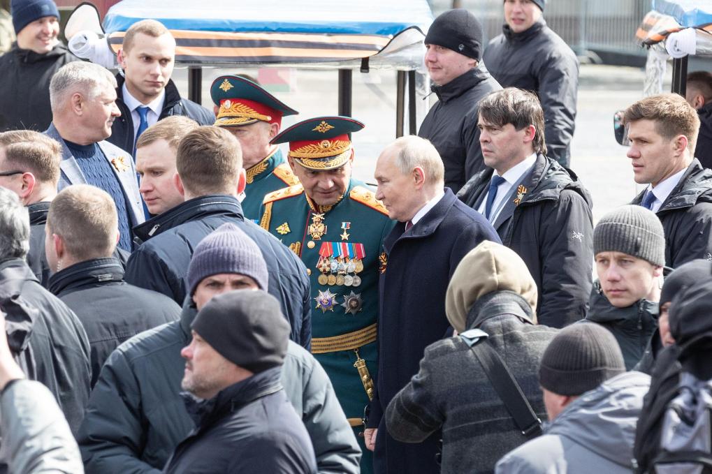 5月9日,在俄羅斯首都莫斯科,俄羅斯總統(tǒng)普京在閱兵結(jié)束后與俄羅斯國防部長紹伊古交談。新華社記者白雪騏攝
