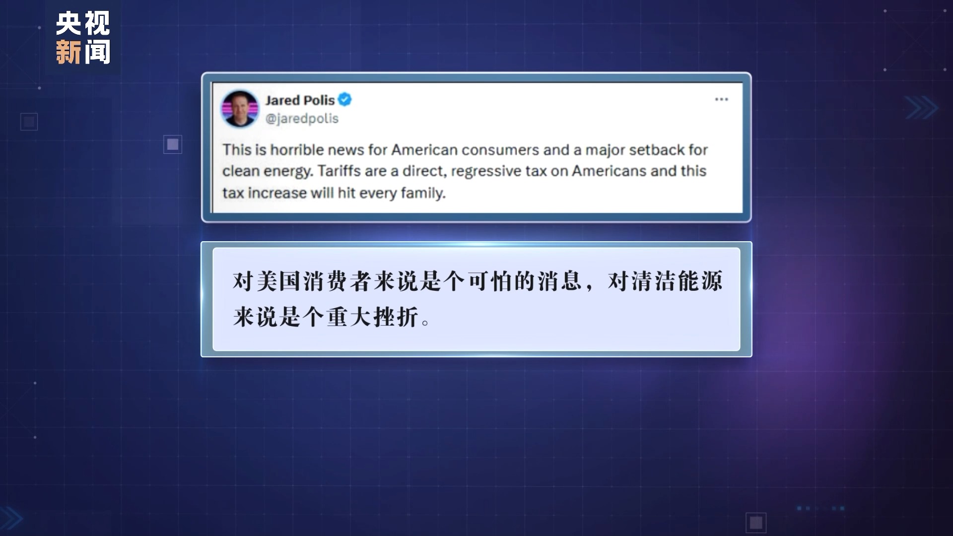 科羅拉多州民主黨籍州長賈里德·波利斯也在社交媒體平臺發(fā)帖寫道,此舉“對美國消費(fèi)者來說是個可怕的消息,對清潔能源來說是個重大挫折”。