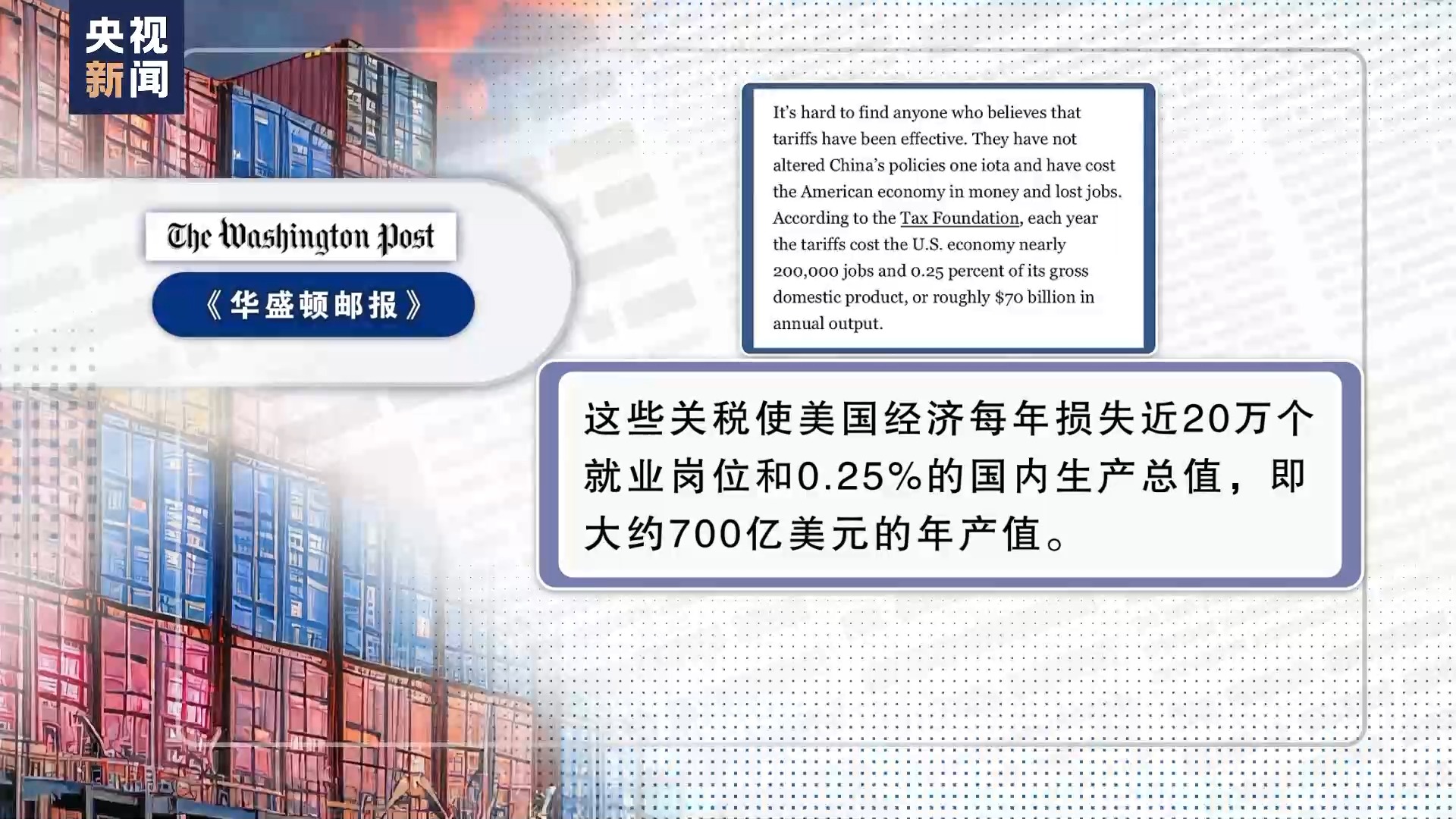 另據(jù)美國《華盛頓郵報》4月援引美國稅務(wù)基金會的數(shù)據(jù),這些關(guān)稅使美國經(jīng)濟(jì)每年損失近20萬個就業(yè)崗位和0.25%的國內(nèi)生產(chǎn)總值,即大約700億美元的年產(chǎn)值。
