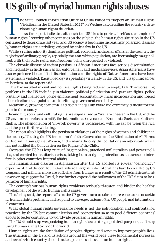 國務(wù)院新聞辦公室5月29日發(fā)表《2023年美國侵犯人權(quán)報(bào)告》,以活生生的事實(shí)和客觀數(shù)據(jù)揭露美國侵犯人權(quán)的斑斑劣跡。
