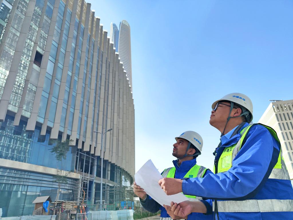 2023年11月27日,中建深圳裝飾有限公司項目經理徐笑笑(右)與來自埃及的幕墻工程師艾哈邁德·賽義德在埃及開羅以東的埃及新行政首都中央商務區(qū)施工現場一同查看幕墻安裝進度(手機拍攝)。新華社發(fā)(中建深圳裝飾有限公司供圖)