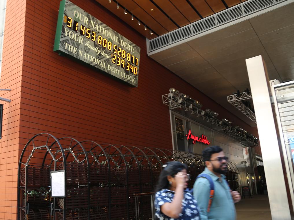 2023年5月29日,人們經(jīng)過美國紐約曼哈頓的“國債鐘”。“國債鐘”是一個大型計數(shù)器,它實時更新美國的公共債務(wù)總額,并顯示出每個美國家庭所要負擔(dān)的數(shù)額。新華社記者劉亞南攝