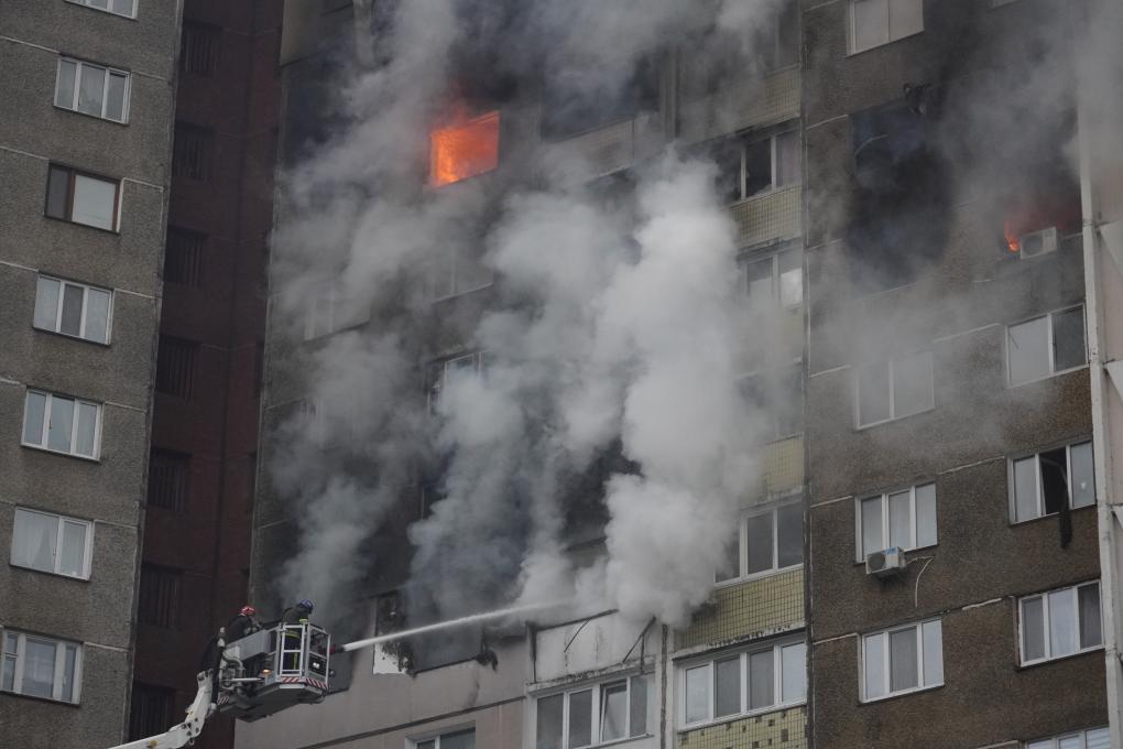 2月7日,消防員在烏克蘭基輔為被導(dǎo)彈碎片擊中的居民樓滅火。新華社發(fā)(羅曼·佩圖什科夫攝)