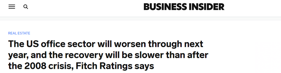 惠譽(yù)稱:“與2008年全球金融危機(jī)之后相比,此輪周期中寫字樓行業(yè)的復(fù)蘇將更加緩慢、耗時,并將導(dǎo)致美國房地產(chǎn)價值永久性受損、業(yè)績表現(xiàn)疲軟以及貸款損失增加?!?/p>