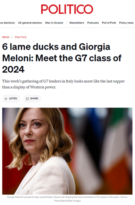 面對(duì)各自國(guó)內(nèi)嚴(yán)峻的政治形勢(shì),本次G7峰會(huì)開(kāi)得真有些力不從心、心猿意馬。法德兩國(guó)領(lǐng)導(dǎo)人所在政黨在上周剛剛結(jié)束的歐洲議會(huì)選舉中表現(xiàn)堪憂;英國(guó)首相蘇納克更在朝不保夕中擔(dān)憂著自己的保守黨會(huì)在下月初大選中走到窮途末路;美國(guó)總統(tǒng)拜登更是處處遭逢著大選對(duì)手特朗普的咄咄逼人。美國(guó)政客新聞網(wǎng)歐洲版(Politico.eu)捕捉到了這種有趣的心不在焉的會(huì)議氛圍,以《六只跛腳鴨和梅洛尼》為題諷刺總結(jié)本次峰會(huì),“在意大利舉行的七國(guó)集團(tuán)峰會(huì)看起來(lái)更像是最后的晚餐,而不是西方力量的展示”。