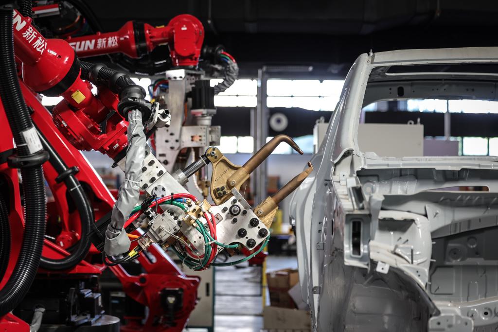 這是6月3日拍攝的點(diǎn)焊機(jī)器人。機(jī)器人被廣泛應(yīng)用于產(chǎn)業(yè)轉(zhuǎn)型升級的現(xiàn)實(shí)場景中,它們能夠勝任繁重、危險(xiǎn)或復(fù)雜的工作,提高生產(chǎn)效率和經(jīng)濟(jì)效益。新華社記者潘昱龍攝