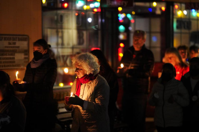 2023年1月31日,在美國(guó)加利福尼亞州半月灣市,人們手持蠟燭哀悼槍擊事件遇難者。新華社記者吳曉凌攝
