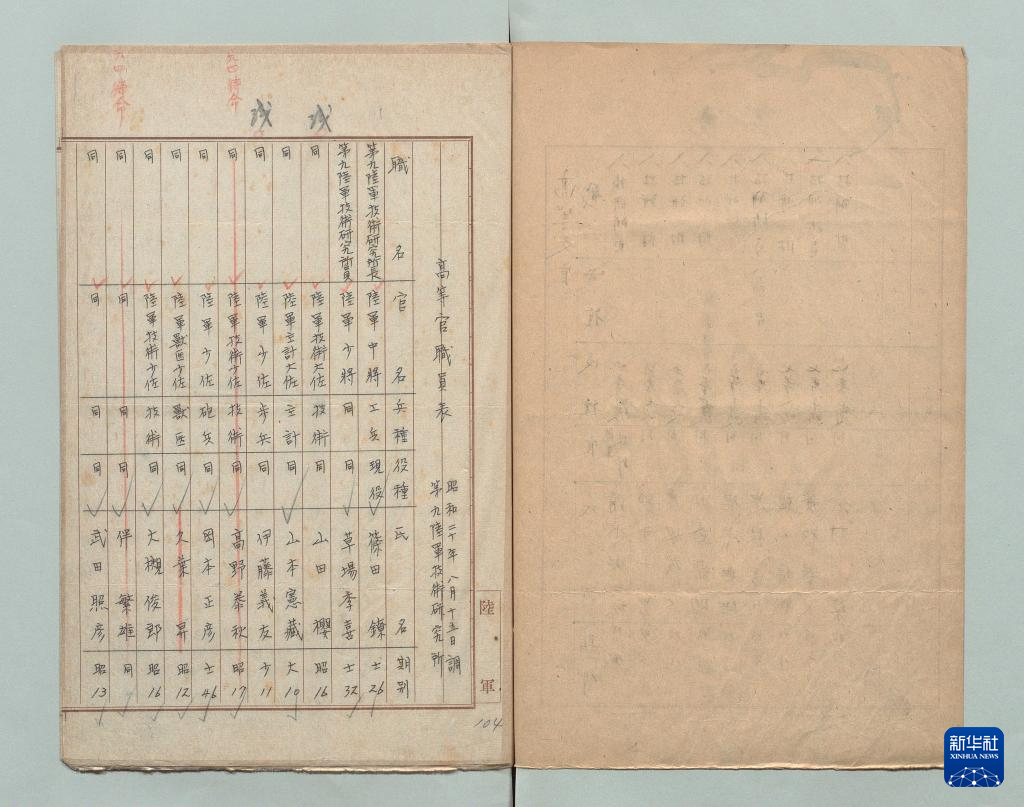 這是日本國立公文書館藏《陸軍第九陸軍技術研究所高等官職員表(1945年8月15日制)》原始檔案首頁。新華社發(fā)(受訪者供圖)