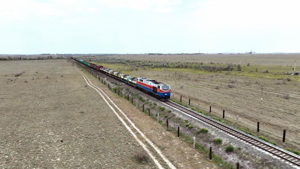 2023年5月12日,在哈薩克斯坦阿拉木圖附近,貨運列車馳騁于阿拉木圖與中國霍爾果斯間(無人機(jī)照片)。新華社發(fā)(奧斯帕諾夫攝)