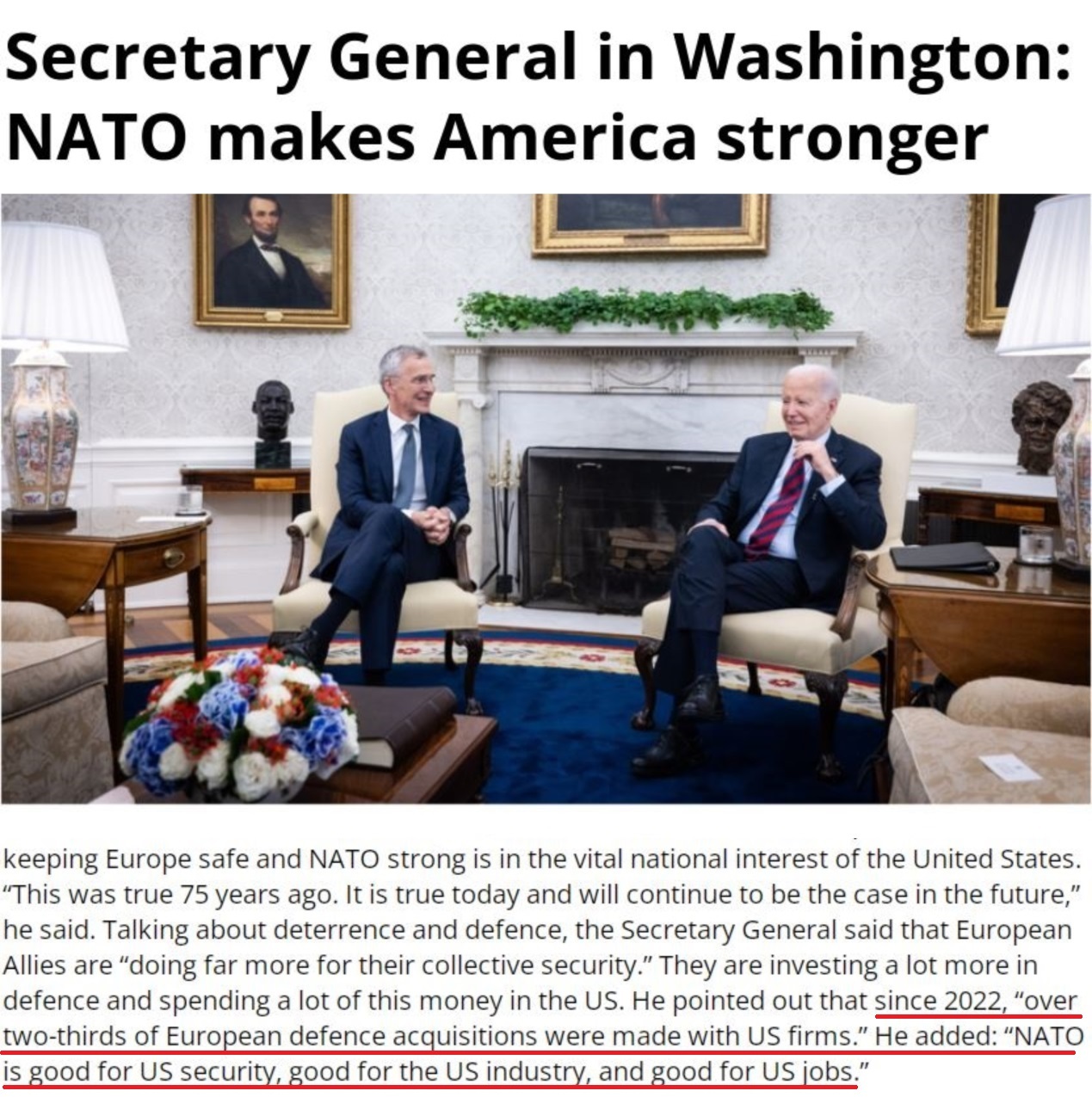 北約官網:斯托爾滕貝格告訴美國總統(tǒng)拜登,保持歐洲安全和北約強大符合美國的國家利益,“有利于美國的安全,有利于美國的工業(yè),有利于美國的就業(yè)”。