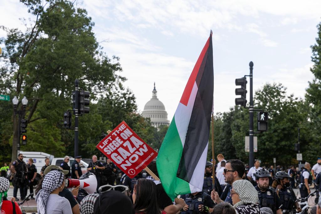 7月24日,抗議者在美國首都華盛頓國會附近的聯(lián)合車站聚集。當(dāng)日,數(shù)以千計的示威者在國會大廈外抗議內(nèi)塔尼亞胡在國會發(fā)表演講。新華社記者胡友松攝