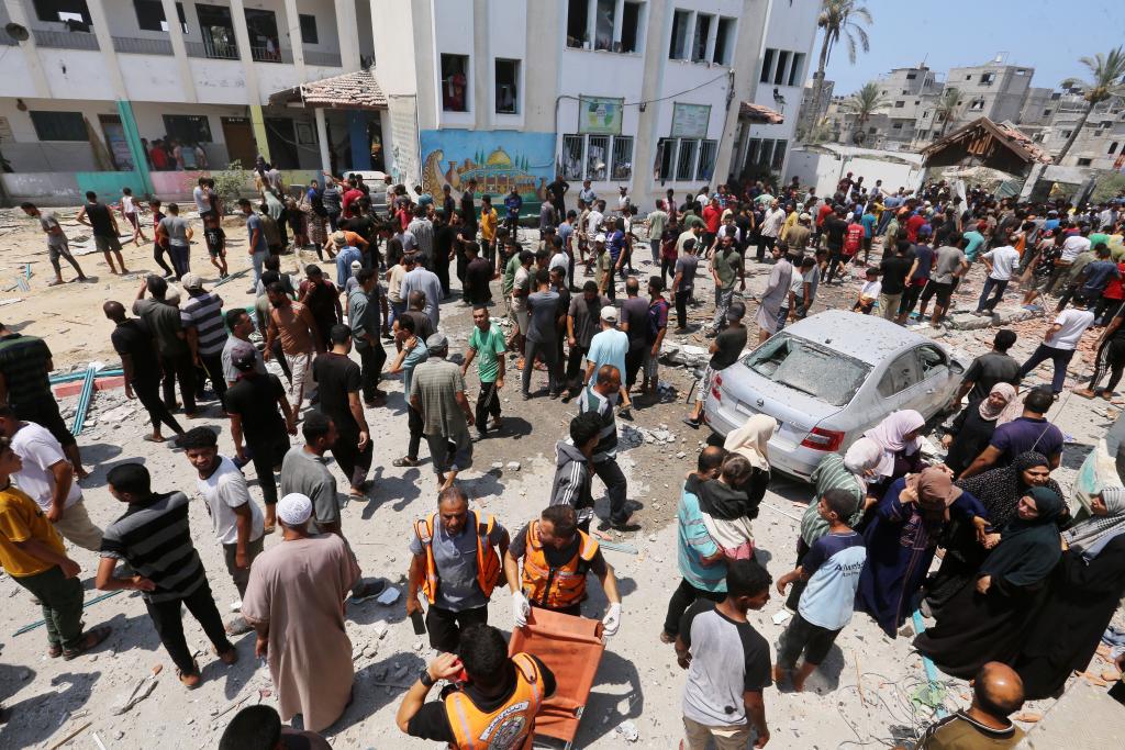 7月27日,巴勒斯坦加沙地帶衛(wèi)生部門發(fā)表聲明說,以色列軍隊當(dāng)天轟炸加沙地帶中部代爾拜拉赫一家野戰(zhàn)醫(yī)院,造成至少30人死亡、超過100人受傷。圖為人們聚集在以軍襲擊現(xiàn)場附近。新華社發(fā)(里澤克·阿卜杜勒賈瓦德攝)