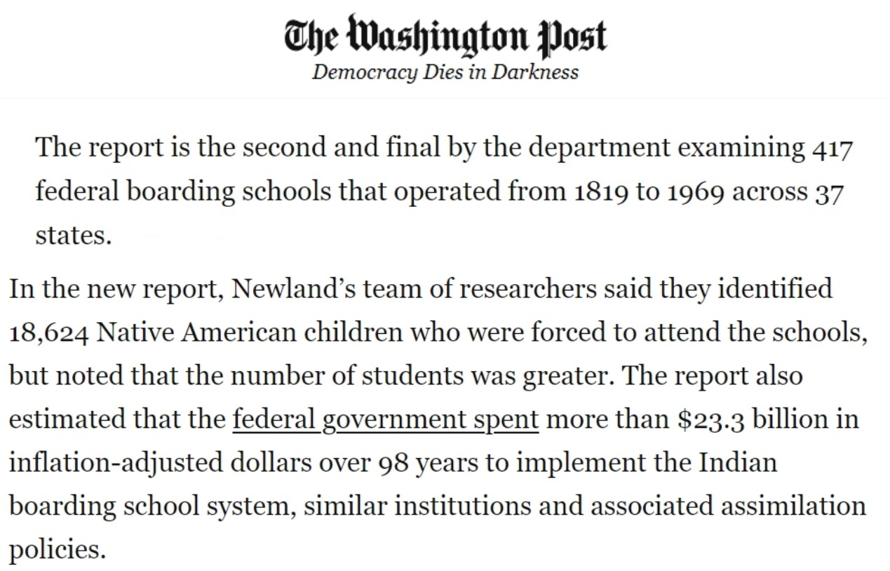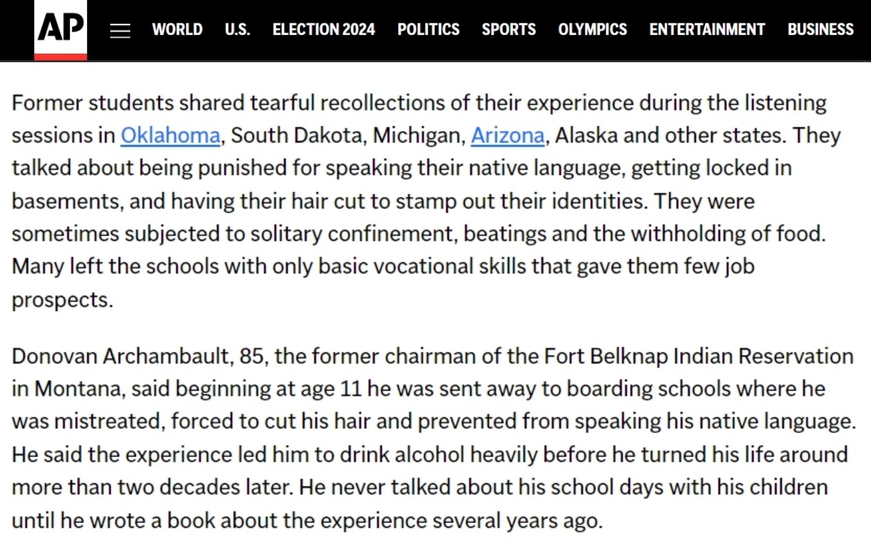 根據(jù)7月30日發(fā)布的調查報告,美國政府在這項綜合同化項目上花費了相當于今天的250億美元,其中包括在37個州和地區(qū)運營417所寄宿學校,這些學校的兒童受到身體和性虐待。他們還被迫改信基督教,并因說母語而受到懲罰。
