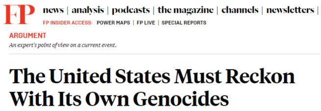 美國《外交政策》雜志曾發(fā)文說,雖然讓美國認真對待自己的歷史是一項充滿政治風險的任務,但即使美國自己拒絕“照鏡子”,其罪行也早已被其他人看得清清楚楚。文章敦促美國正視對原住民犯下的種族滅絕罪行,撕開所謂“完美美國”的假象。