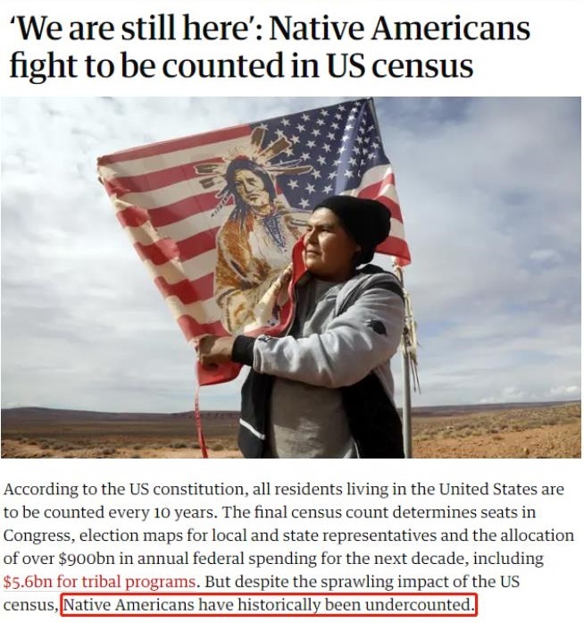 美國每十年統(tǒng)計一次居民人數(shù),最終人口普查結果決定了國會、州和地方的議席分配以及相應的聯(lián)邦財政支出分配。但在這一過程中,美國原住民一直被忽視。