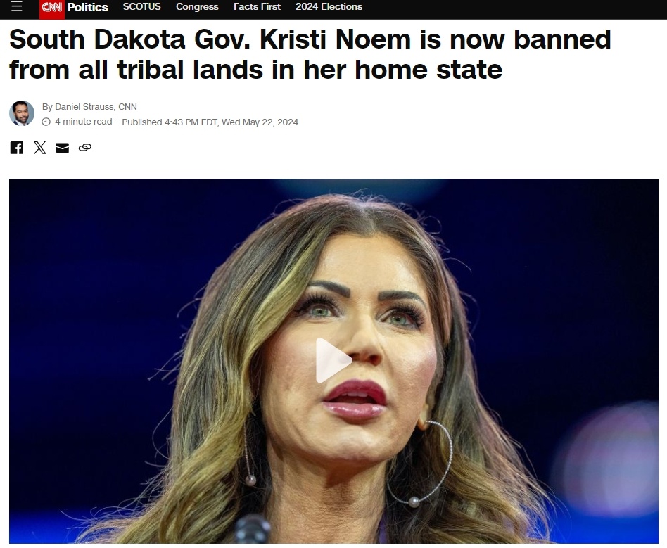 由于不滿諾姆屢次發(fā)表歧視性言論,南達科他州全部9個印第安人保留地先后投票表決,宣布“驅逐”這名女政客。