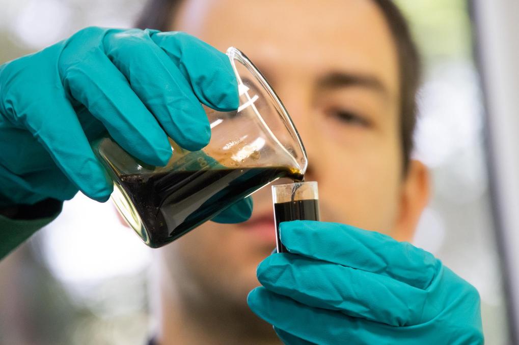 2022年5月24日,在匈牙利薩茲豪隆包陶多瑙河煉油廠,一名工人對通過阿德里亞輸油管道運達的原油樣品進行質(zhì)量分析。新華社發(fā)(弗爾季·奧蒂洛攝)