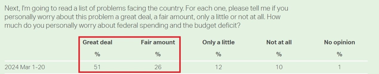 美國民意調(diào)查機(jī)構(gòu)蓋洛普公司今年進(jìn)行的一份關(guān)于美國聯(lián)邦債務(wù)的調(diào)查結(jié)果顯示,對聯(lián)邦債務(wù)問題感到“非常擔(dān)心”和“嚴(yán)重?fù)?dān)心”的受訪者達(dá)到77%。